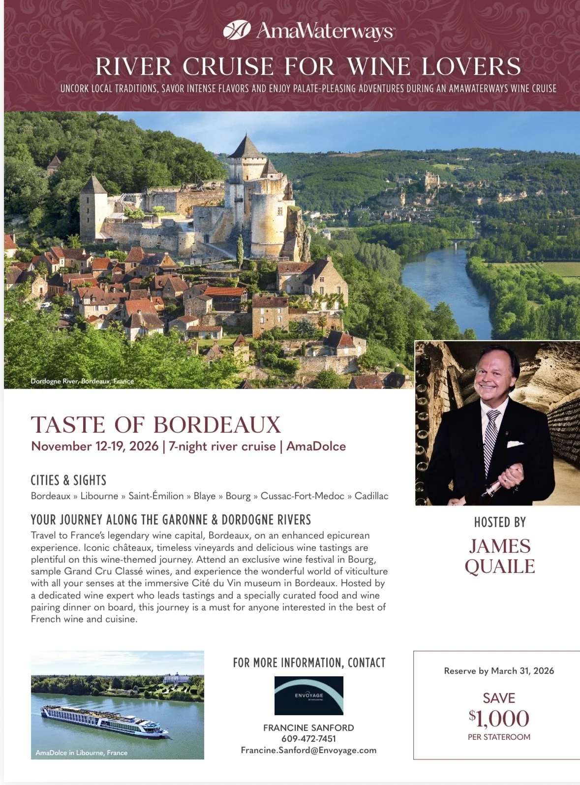 Join Jimmy on a river cruise through France! In November 2026, Jimmy will be hosting “Taste of Bordeaux” on AmaWaterways.